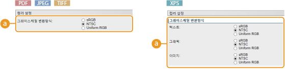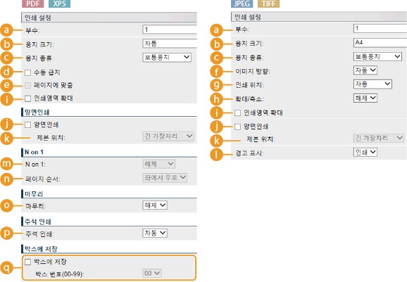 XPS 파일의 인쇄 설정을 지정할 경우[인쇄 티켓 우선] 확인란의 선택을 해제합니다. 해당 확인란이 선택되어 있으면, 일부 항목을 사용할 수 없게 됩니다.
