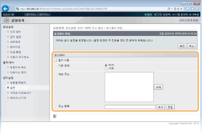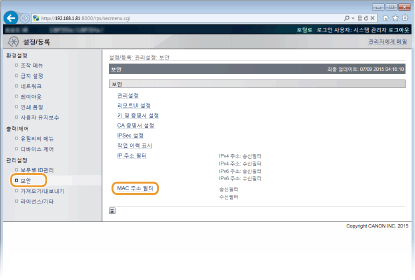 MAC 주소가 잘못 입력되면 리모트 UI에서 기기에 액세스하지 못할 수도 있으며 이런 경우 <주소 필터>를 <해제>로 설정해야 합니다. 주소 필터