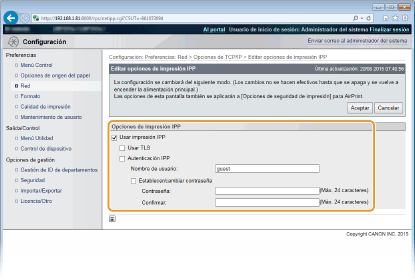 ![]() Si utiliza IPPS, habilite la función de comunicación cifrada TLS. Utilizar TLS para comunicaciones cifradas