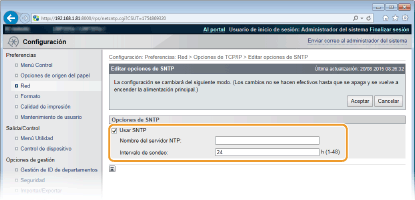 [Red] [Opciones de TCP/IP] y, a continuación, haciendo clic en [Comprobar conexión de servidor NTP] en [Opciones de SNTP] que aparece.Si se ha establecido una conexión correctamente, el resultado aparece como se indica a continuación.Tenga en cuenta que esta operación con ajusta el reloj de sistema.![]() Selección de opciones desde el panel de controlTambién puede habilitar o deshabilitar las opciones de SNTP desde el menú de configuración del panel de control. SNTP