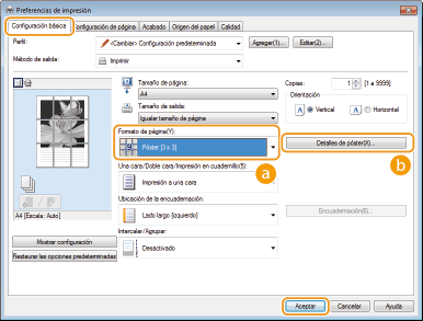 Las opciones de tamaño de los pósteres no pueden seleccionarse cuando está habilitada la impresión a doble cara. Seleccione [Impresión a una cara] en [Una cara/Doble cara/Impresión en cuadernillo] y, a continuación, seleccione una opción de tamaño de póster.