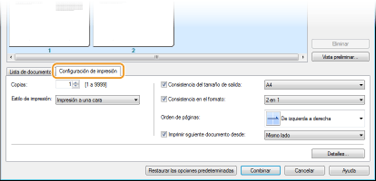 Haga clic en la pestaña [Configuración de impresión] para mostrar la pantalla de especificación de las opciones de impresión, como el número de copias o la impresión a una cara/doble cara. Las opciones especificadas aquí se aplican a todo el trabajo de impresión.