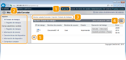 Muestra la página [Monitor estado/Cancelar]. Puede usar esta página para comprobar el estado de impresión actual, cancelar la impresión y ver un historial de los trabajos de impresión.