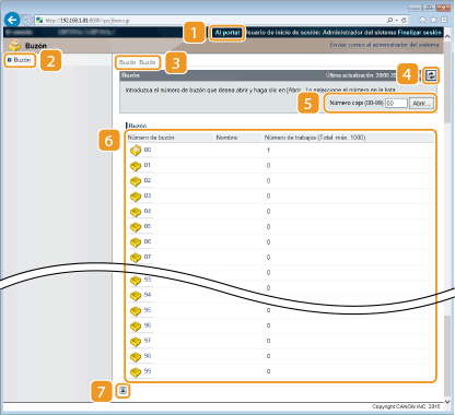 Muestra la página [Buzón]. Puede imprimir y eliminar los documentos guardados en el equipo.