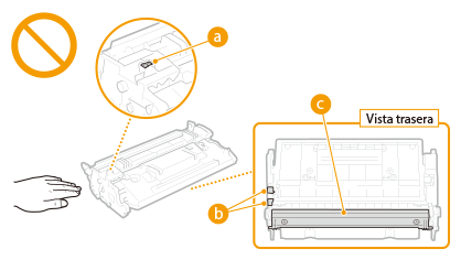 ) ni los contactos eléctricos ( ). Para evitar arañar la superficie del tambor del interior del equipo o exponerlo a la luz, no abra la tapa protectora del tambor ( ).![]() A menos que sea necesario, no extraiga el cartucho de tóner del material de embalaje ni de este equipo.