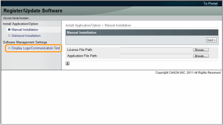 从远程用户界面首页单击 [设置/注册] → [许可证/其他] → [注册/更新软件]。