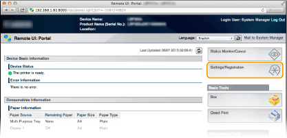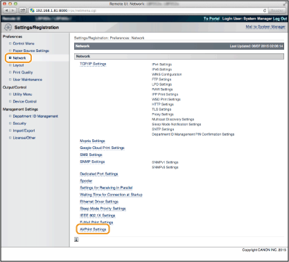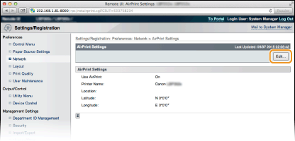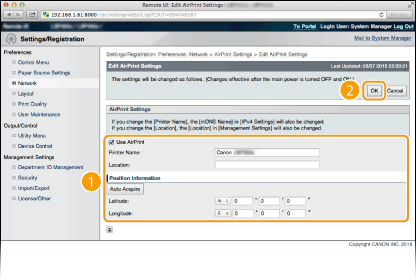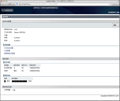 可以注册用来识别本机的信息,包括本机名称和安装位置。也可以禁用本机的 AirPrint 功能。使用远程用户界面改变这些设置。