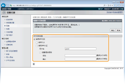 [使用IPP认证] 当为 IPP 打印使用用户认证功能时,选择该复选框并设置用户名和密码。不使用时,取消选择该复选框。