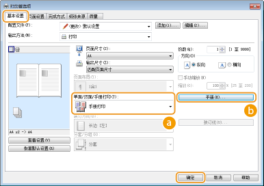 对于某些尺寸和类型的纸张,可能无法使用手册打印。可用于双面打印的纸张也可用于手册打印。请参阅纸张。