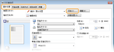 单击 [基本设置]、[页面设置]、[完成方式]、[纸张来源] 或 [质量] 选项卡,根据需要在各画面上指定打印设置。打印设置
