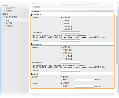 选择此项可指定单个 IPv6 地址或 IPv6 地址范围以应用 IPSec。在 [手动设置的地址] 文本框中输入 IPv6 地址(或范围)。