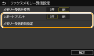 メモリー受信するたびに受信結果レポートを印刷するように設定できます。設定する場合は、<ON>を選びます。なお、この機能を使うためには<受信結果レポート>を<ON>に設定しておく必要があります。