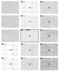 テキストと背景の濃度が均一な地紋は地紋印刷の効果が高くなりますが、コピー後のテキストの浮き上がりが弱くなります。濃度調整後、地紋印刷した原稿をコピーして浮き上がり方を確認することをおすすめします。