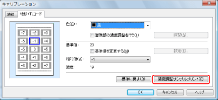サンプルプリント上で太線の枠で囲まれている地紋イメージは、現在[キャリブレーション]ダイアログボックスで設定されている背景濃度を反映した地紋イメージです。