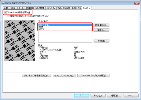 [印刷時に地紋スタイルの選択を許可する]にチェックマークを付けると、ドキュメントプロパティーダイアログボックスに[Trust-S]タブが追加され、アプリケーションソフトウェアから印刷を行うたびにスタイルを選択することができます。スタイルの追加、編集、削除を行なう場合には、プリンタープロパティーダイアログボックスから[Trust Stamp]タブを表示してください。