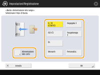 2 | Selezionare l'orientamento e il tipo di busta. ![]() Se è stato modificato il posizionamento delle buste, premere <Alimentazione lato corto> o <Alimentazione lato lungo> e selezionare il tipo di busta. Se è stato scelto il posizionamento verticale per le buste Nagagata 3, premere <Avanti> e specificare la lunghezza della linguetta. Per registrare una busta in formato personalizzato, premere <Personalizz.> <Avanti> quindi <X> o <Y> per specificare il lato, quindi utilizzare i tasti numerici per inserire la lunghezza del lato specificato.![]() Quando si usano le buste Kakugata 2, posizionarle orizzontalmente. |