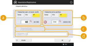 Non è possibile configurare le impostazioni per il Rapporto attività fax mentre <Visualizzazione registro lavori> in <Impostazioni gestione> è <Off>. Inoltre, se si cambia <Visualizzazione registro lavori> in <Impostazioni gestione> da <Off> a <On>, <Stampa/invio ogni n. di trasmiss. specific.> e <Stampa/invio all'ora specificata> nel Rapporto attività fax diventano automaticamente <Off>. |