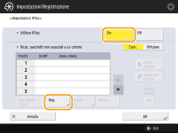 3 | Specificare la porta a cui applicare l'IPSec. Premere <Specifica per numero di porta> per utilizzare i numeri di porta quando si specificano le porte a cui applicare l'IPSec. Selezionare <Tutte le porte> per applicare l'IPSec a tutti i numeri di porta. Per applicare l'IPSec ad un numero di porta specifico, premere <Porta singola> e inserire il numero di porta. Dopo aver specificato le porte, premere <OK>. Specificare la porta di questa macchina in <Porta locale> e specificare la porta del peer di comunicazione in <Porta remota>. ![]() Premere <Specifica per nome servizio> per utilizzare i nomi dei servizi quando si specificano le porte a cui si applica l'IPSec. Selezionare il servizio nell'elenco, premere <Servizio On/Off> per impostarlo su <On> e premere <OK>. ![]() | ||||||||||||||