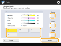 Puede registrar hasta cuatro opciones después del ajuste. Después de ajustar el color, pulse <Recuperar/Guardar> seleccione un botón entre <C1> y <C4> pulse <Guardar> <Sí> <Aceptar>.![]() ![]() Para recuperar las opciones registradas, pulse <Recuperar/Guardar>, seleccione un botón y pulse <Aceptar>. Puede cambiar los nombres de los botones de <C1> a <C4>. Seleccione el botón que quiere cambiar, pulse <Cambiar nombre> y escriba otro nombre. Para eliminar las opciones registradas, seleccione el botón pulse <Eliminar> <Sí>. |