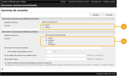 Para utilizar el equipo como servidor/cliente, seleccione [Iniciar] para [Servicio] en [Sincronizar opciones personalizadas (Servidor)] y [Sincronizar opciones personalizadas (Cliente)].
