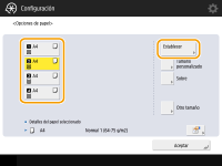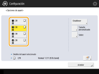Si no se muestra el tipo de papel cargado, pulse <Opciones detallad.> para seleccionarlo de una lista.