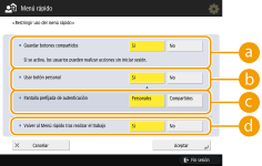Puede establecer restricciones al uso de los botones Personales y los botones Compartidos. También puede configurar si desea que aparezcan los botones Personales y los botones Compartidos al mostrar por primera vez el Menú rápido. Inicio de sesión en el equipo