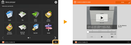 Cuando la unidad de tambor se acerca al final de su vida útil, aparecerá un mensaje indicándole que sustituya la unidad de tambor en la parte inferior de la pantalla. Pulse el icono en la parte inferior derecha de la pantalla, y siga las instrucciones en pantalla para sustituir la unidad de tambor.