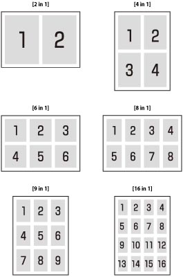 PDFファイルのデータを、1ページに複数ページ並べてプリントできます。複数ページを印刷する場合、左(上)から並べてプリントされます。