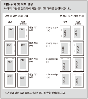 펀치 위치 설정(이전 설정)에서 만든 여백을 따라 가장자리를 지정할 수 있습니다. 용지 가장자리 중 한 곳을 따라 여백을 만들려면 펀치 위치 설정과 함께 이 설정을 사용해야 합니다.