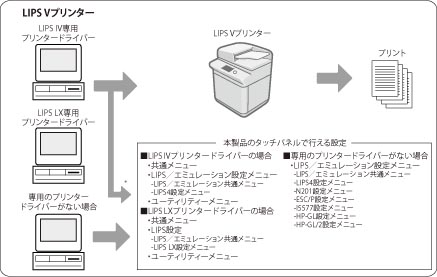 プリンターの種類によって、本製品のタッチパネルで行える設定は異なります。詳しくは下記を参照してください。