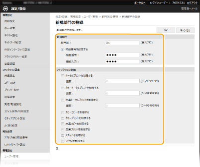 部門IDを登録し、暗証番号を設定します。管理の対象とする部門IDをすべて登録してください。