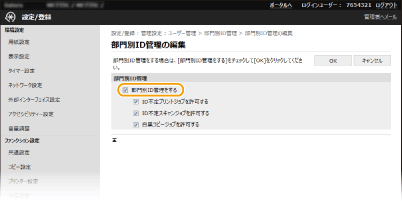 チェックマークを付けると部門別ID管理が有効になります。部門別ID管理をしないときはチェックマークを外してください。