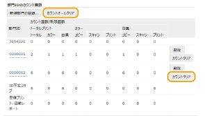 カウントをゼロに戻したい場合は、[カウントクリア]  [OK]の順にクリックします。全部門IDのカウントを一斉にゼロに戻す場合は、[カウントオールクリア]  [OK]の順にクリックします。