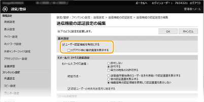 認証送信のログイン画面で入力したユーザー名とパスワードでサーバーに認証します。[ユーザー認証機能]にチェックマークを付けると、送信実行時にこれらのユーザー名とパスワードを引き継いだ状態の認証画面を表示します。