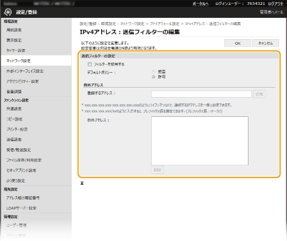 IPアドレスを間違えて設定すると、リモートUIからアクセスできなくなることがあります。この場合は、操作パネルから<IPv4アドレスフィルター>または<IPv6アドレスフィルター>を<OFF>にしてください。