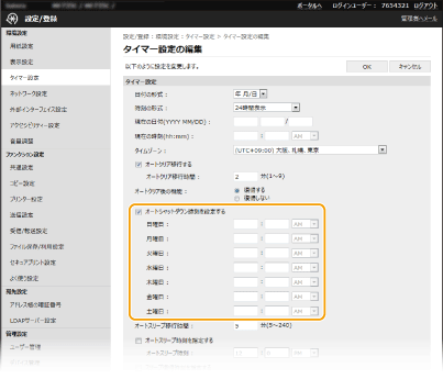 *指定した時刻に電源を切ることができなかったときは、1 分ごとに最大 10 回まで再試行します。それでも電源を切ることができなかった場合、その日は自動的に電源が切られません。