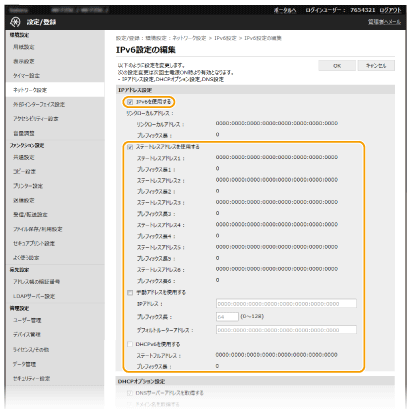 IPv6アドレスはリモートUIを使って設定します。IPv6アドレスを使うためには、IPv4アドレスが適切に設定されている必要がありますのであらかじめ確認しておいてください(IPv4の設定を確認する)。また、IPv6環境ではスキャナードライバーやMF Scan Utilityによるスキャンはできませんのでご注意ください。IPv6は、次のような複数のアドレスを登録できます。