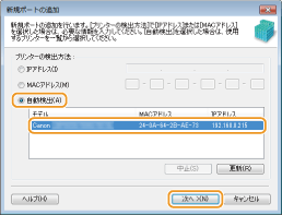 [更新]をクリックします。それでも表示されないときは、[IPアドレス]または[MACアドレス]を選び、本機のIPアドレスまたはMACアドレス(ネットワークの設定を確認する)を入力してから[次へ]をクリックします。