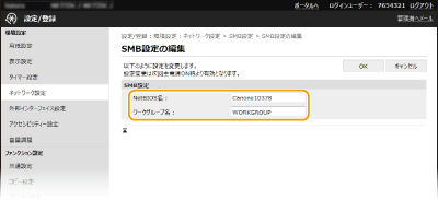 SMBは、ネットワーク内の複数デバイス間でファイルやプリンターを共有するためのプロトコルで、本機ではスキャンした文書を共有フォルダーに保存するときなどに使用します。お使いのネットワーク環境によっては、NetBIOS名とワークグループ名の設定が必要です。