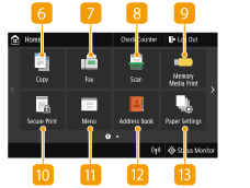 ![]() | <Copy>Use this button to start copying. Copying <Fax>Use this button to send a fax from the machine. Faxing ![]() The optional product is required for faxing to use the fax function. System Options <Scan>Scans an original and converts it into an electronic file. You can save scanned files on your computer or send them via e-mail. Scanning <Memory Media Print>Prints files stored in a USB memory media. Printing from a USB Memory Device (Memory Media Print) <Secure Print>Use this function to print a secure document. Printing a Document Secured by a PIN (Secure Print) <Menu><Function Settings>, <Preferences>, and many other machine settings start from this button. Setting Menu List <Address Book>Use this to register or edit the destinations for e-mails and faxes. You can also display a registered destination when sending an e-mail or fax. Registering Destinations <Paper Settings>This button is also used for specifying the size and type of paper loaded in the paper drawer and multi-purpose tray. Specifying Paper Size and Type | |