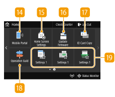 ![]() | <Mobile Portal>Use this to establish a connection to a mobile device. Connecting with Mobile Devices <Home Screen Settings>Allows you to change the order that Home screen buttons are displayed in. Customizing the Home Screen <Update Firmware>Allows you to update the firmware via the Internet. Updating the Firmware <ID Card Copy>Use this function to copy the front and back sides of a driver's license or other card onto the same side of a page. Making ID Card Copies <Operation Guide>Press to view operation guidance and error causes/solutions. Shortcut buttonsDisplay "Favorite Settings" that are registered to Copy, Fax, and Scan. Adding Buttons to the Home Screen |
