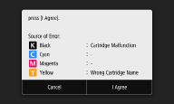 ConsumablesA malfunction may occur. A non-Canon toner cartridge or a toner cartridge of the wrong color may be inserted. To use this cartridge, press [I Agree]. Source of Error