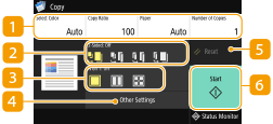 The setting status, such as copy ratio, copy paper, and number of copies, are displayed. To copy correctly, be sure to check the settings displayed here. When you want to change a setting, select the desired setting item.