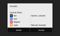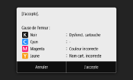 ConsommablesUn dysfonctionnement peut apparaître. Une cartouche de toner non authentique Canon ou une cartouche de toner de couleur incorrecte est peut-être insérée. Pour utiliser cette cartouche, appuyez sur [J'accepte]. Cause de l'erreur