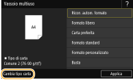 1 | Selezionare <Formato personalizzato>. ![]() È possibile specificare il formato della carta come <Formato libero>, eliminando così la necessità di specificare il formato della carta. Specificare <Formato libero> quando si carica carta di formato sconosciuto da utilizzare per la copia o quando il formato della carta è già registrato nel driver della stampante. |