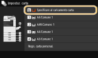 Dopo aver registrato l'impostazione predefinita per la carta, la schermata dell'impostazione non viene visualizzata quando si carica la carta, e viene utilizzata sempre la stessa impostazione. Se si carica carta di formato o tipo diverso senza modificare le impostazioni, la macchina potrebbe non stampare correttamente. Per evitare questo problema, selezionare <Specificare al caricamento carta> al passo 3, quindi caricare la carta. |