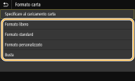 1 | Selezionare <Formato personalizzato>. ![]() È possibile specificare il formato della carta come <Formato libero>, eliminando così la necessità di specificare il formato della carta. Specificare <Formato libero> quando si carica carta di formato sconosciuto da utilizzare per la copia o quando il formato della carta è già registrato nel driver della stampante. |