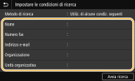 7 | Selezionare <Avvia ricerca>. Vengono visualizzati gli utenti che soddisfano i criteri di ricerca. ![]() Se viene visualizzata la schermata di autenticazione quando si seleziona <Avvia ricerca>, digitare il nome utente della macchina e la password registrati nel server LDAP, quindi selezionare <Applica>. Registrazione server LDAP |