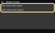 6 | Selezionare le condizioni per visualizzare il risultato di ricerca. ![]() <Utiliz. di tutte condiz. seguenti> Cerca e visualizza gli utenti che soddisfano tutti i criteri di ricerca specificati ai passi 3 e 4. <Utiliz. di alcune condiz. seguenti> Se si trovano utenti che soddisfano anche uno dei criteri specificati ai passi 3 e 4, visualizza tutti quegli utenti. |