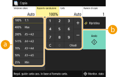 <Orig./Tipo fin.>![]() | È possibile ingrandire o ridurre le copie utilizzando un rapporto di riproduzione predefinito come <A5->A4> o impostando un rapporto di riproduzione personalizzato con incrementi dell'1%. |